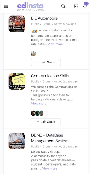 Edinsta is a social learning network where students and professionals join subject-based groups, share notes, ask doubts, and learn together.